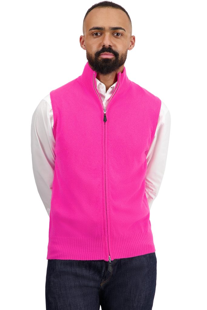 100% kašmír, 2 vrstvy. Pánská vesta s vysokým límcem a zapínáním na oboustranný zip. Na spodní části ozdobena výrazným žebrováním.